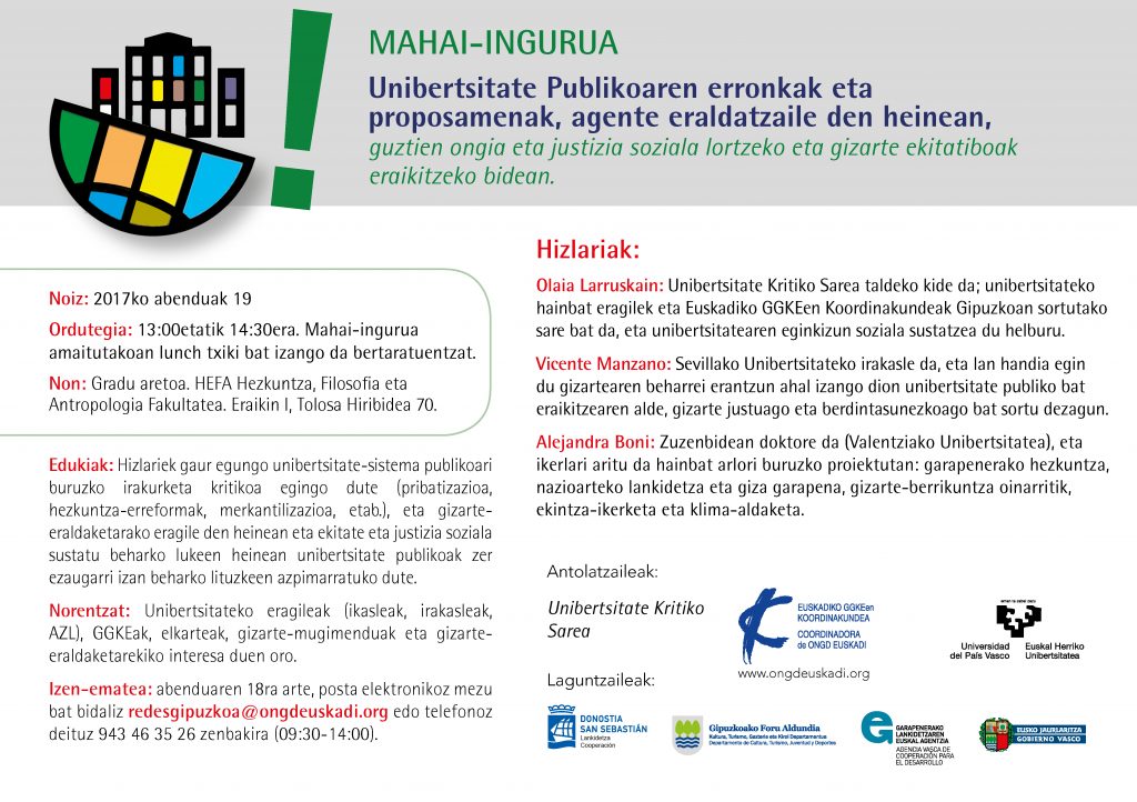 Hizlariek gaur egungo unibertsitate-sistema publikoari buruzko irakurketa kritikoa egingo dute (pribatizazioa, hezkuntza-erreformak, merkantilizazioa, etab.), eta gizarteeraldaketarako eragile den heinean eta ekitate eta justizia soziala sustatu beharko lukeen heinean unibertsitate publikoak zer ezaugarri izan beharko lituzkeen azpimarratuko dute.